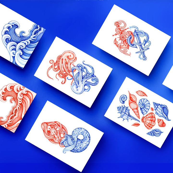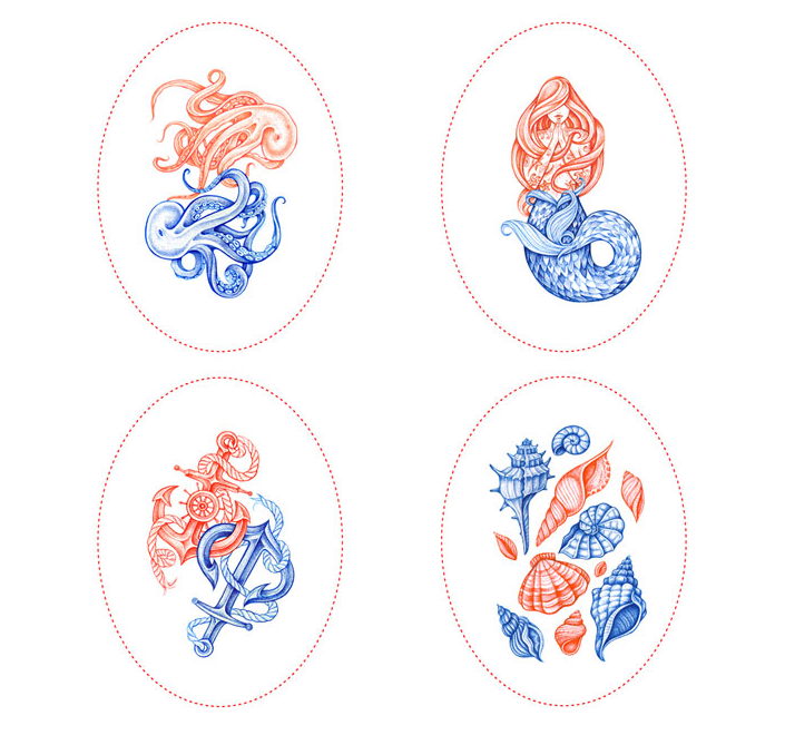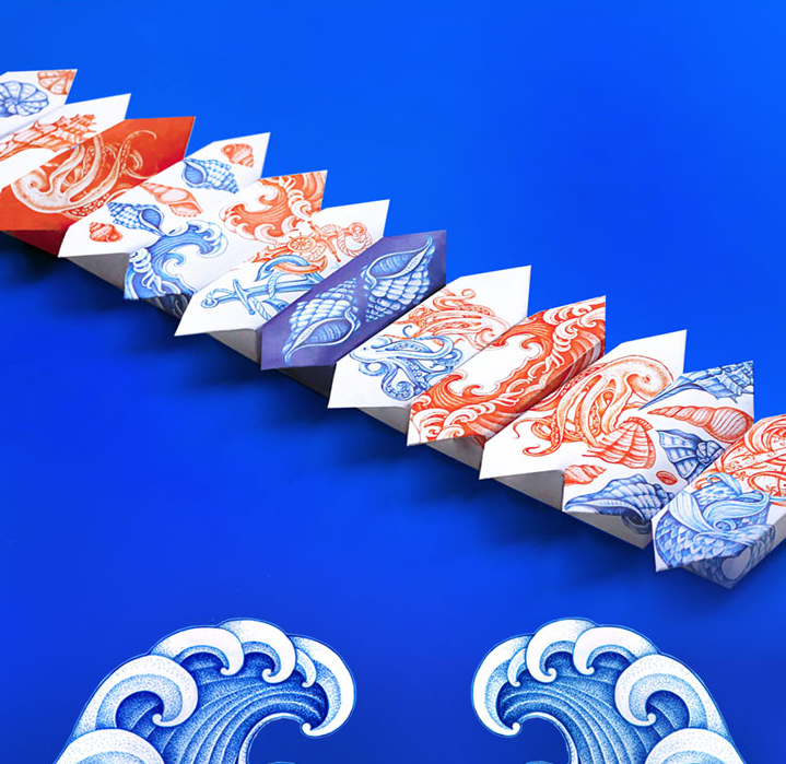 這條由伴侶工作室設(shè)計的糖果制作精美,在一個干凈的白色表面上使用華麗的紅色和藍(lán)色的插圖。圖紙是復(fù)雜的,優(yōu)雅的手繪線的組合收斂。美麗的海上圖案被翻譯在外包裝上,并在個別包裝上,每一個甜蜜的折疊在一個豐富多彩的封面。