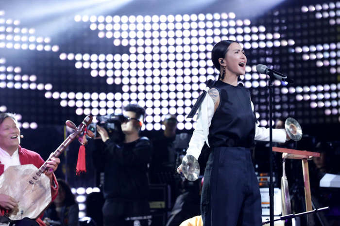 在本期節(jié)目譚維維所演唱的原創(chuàng)歌曲《給你一點顏色》顛覆了搖滾樂固有形式,請來五位老人演奏樂器,將小眾戲曲曲種“華陰老腔”搬上主流舞臺,為自己的”譚式搖滾“注入新鮮元素,席地而坐的老人用板凳、梆子、六角形月琴為樂器,而譚維維則手持鑼鼓,帥氣獻唱。